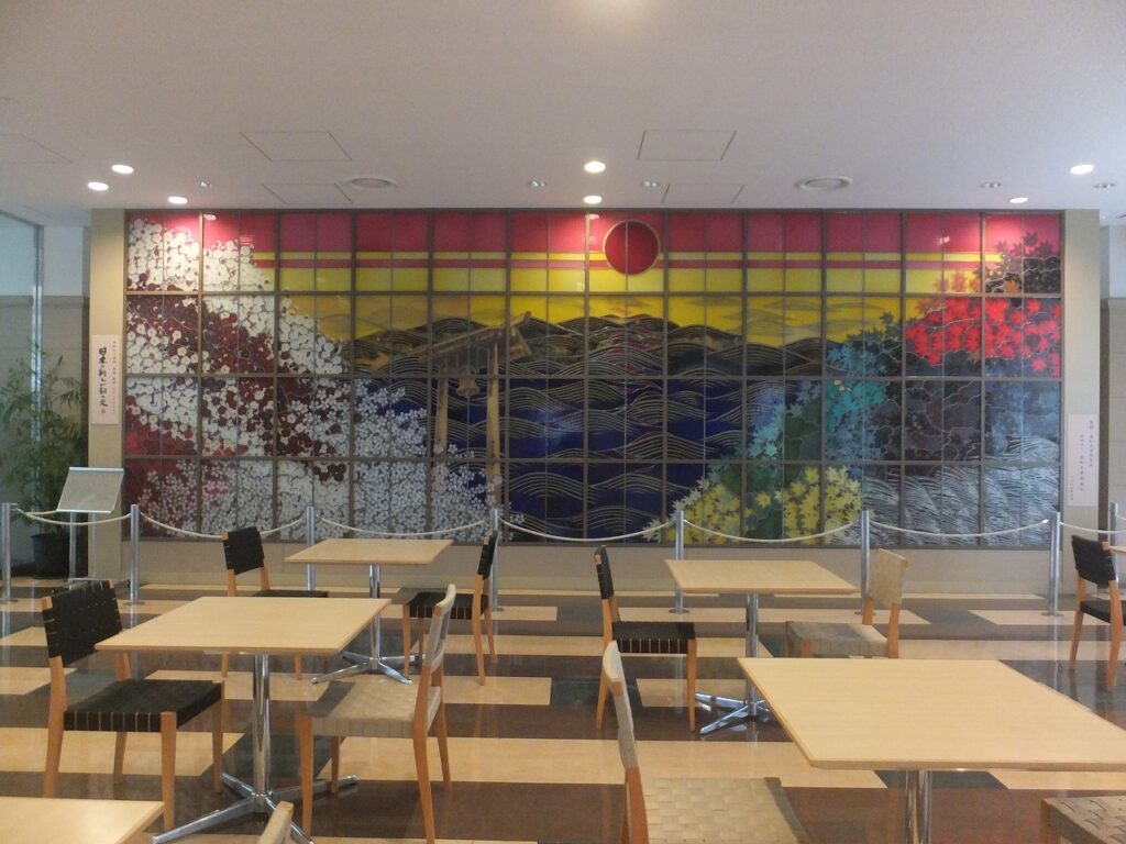 名古屋キャンパス 名古屋市中村区 「愛の郷とあいの山河」平松礼二作 「あいの山河とあいの人々」平松礼二作 「あいの山河」平松礼二作 「愛の郷」平松礼二作 「あいの人々」平松礼二作 車道キャンパス 東区筒井2 「日本の新しい朝の光」平松礼二作